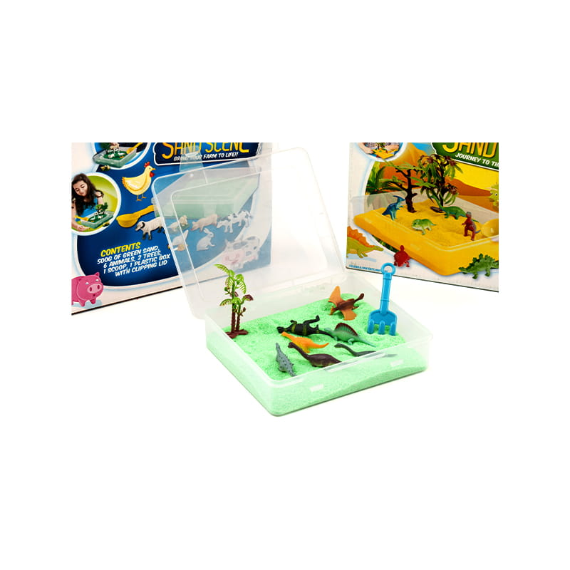 Farm/Dino Sand Scene, är en kreativ sandspeluppsättning designad för barn. Den innehåller en klar plastlåda, rik färgad sand och en mängd söta djurdekorationer. Barn kan skapa fritt på sanden och ordna sina favoritdjur och växtdekorationer för att skapa en unik gård eller dinosaurie. Detta spel kan inte bara stimulera barns kreativitet och fantasi, utan också låta dem lära sig om djur och förhistoriska varelser i spelet och njuta av en lycklig inlärningstid.